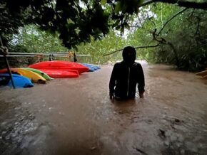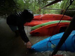 24時間以上も降り続いた強い雨によって川が大増水したため、 カヌー置き場のカヌーが流されないように避難作業へ向かいました。