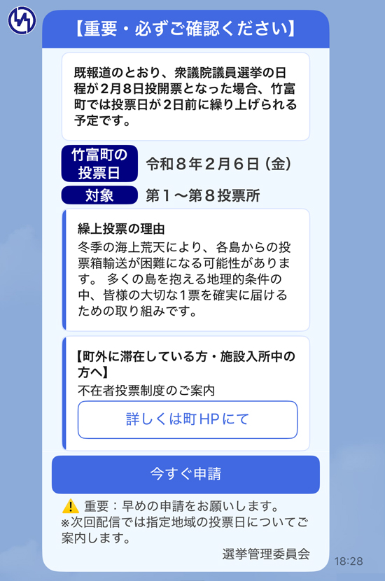 ちなみに通常の投票日においても離島は一日早い繰り上げ投票ですが、今回の衆院選は真冬。