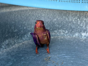 つかまえている間も「ギー ギィーー!」と鳴き続け、まだケガをして間もないのか、飛べないこと以外は意識もしっかりして元気そのものです。