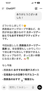 試しにしゅうさんも「西表島でおすすめのカヌーツアーのお店を教えてください」と質問してみました。